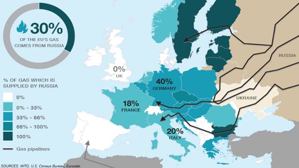 На този етап Русия остава най-големия доставчик за Европа на петрол, природна газ и въглища, покривайки над 30% от европейски нужди за тези енергийни източници, но в замяна на това Москва получава приходи в размер на 250 млрд. долара на година.