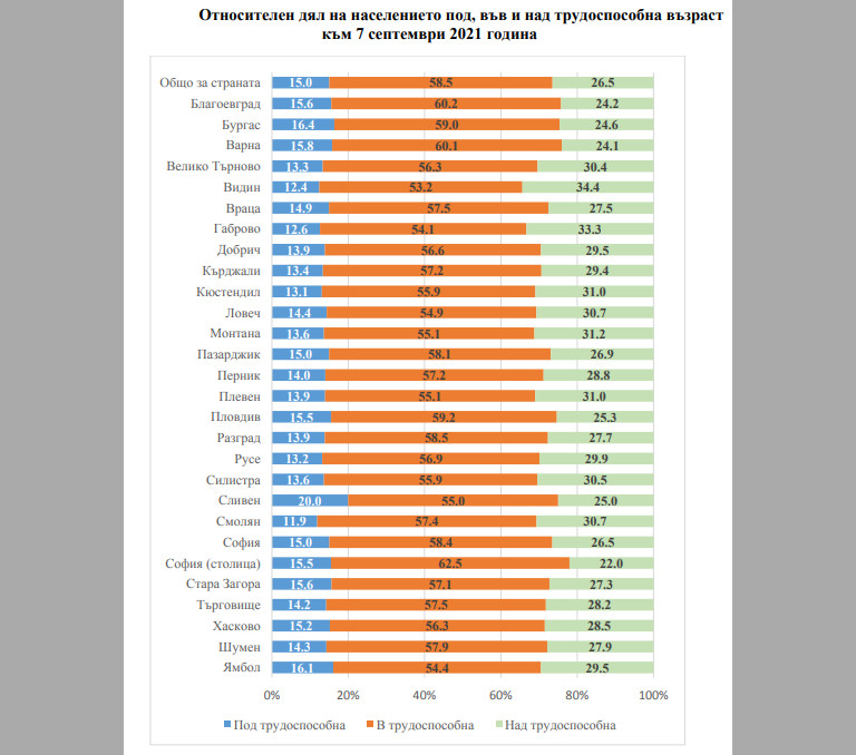 Тенденцията на застаряване на населението води до промени и в неговата основна възрастова структура - под, във и над трудоспособна възраст. Влияние върху съвкупностите на населението във и над трудоспособна възраст оказват както застаряването на населението, така и законодателните промени при определянето на възрастовите граници за пенсиониране. За 2021 г. тези граници са от 16 до навършването на 61 години и 8 месеца за жените и 64 години и 4 месеца за мъжете.