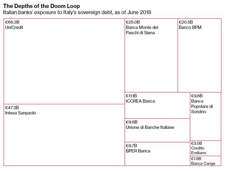 Експозициите в държавни облигации на UniCredit към юни 2018 година възлизат на 66,3 милиарда евро, а тези на Intesa Sanpaolo са в размер на 47,3 милиарда евро. Тези експозиции на Banca Monte dei Paschi di Siena, която Рим трябваше да спаси от фалит преди две години, възлизат на 25 милиарда долара.