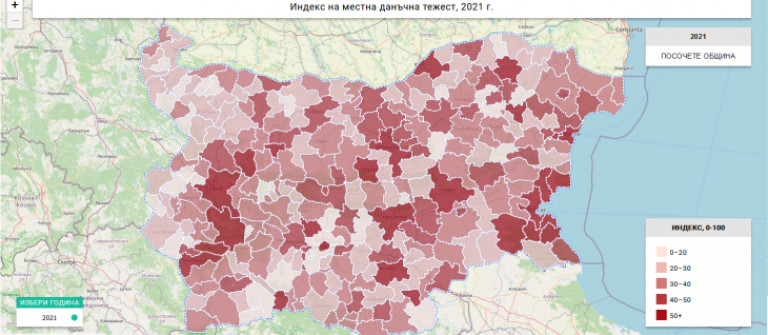 Интерактивните карти позволяват да се видят и сравнят размерите както на общата данъчна тежест, така и на всеки от разглежданите местни данъци за всички 265 български общини. На областно ниво със значително по-ниско ниво на усреднените местни данъци са Видин и Монтана, а с най-високо - столицата. Сред общините най-ниска е усреднената данъчна тежест в Грамада (Видинско), Сатовча (Благоевградско), Георги Дамяново (Монтанско), а най-висока - в Созопол, София, Пловдив и Бургас.