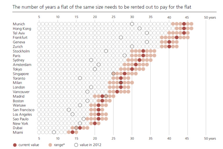 Световните градове, в които жилищата се изплащат най-бавно (средно 44 години) са Мюнхен, Хонконг и Тел Авив, следвани от Франкфурт (42 години), Женева и Цюрих (средно по 40 години). Тези резултати показват прекомерната зависимост на цените на жилищата от ниските лихвени проценти. Цените на жилищата във всички тези градове са уязвими от рязка корекция, ако лихвените проценти продължат да се покачват.